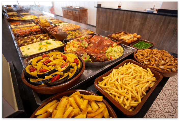 – Buffet Frio, com várias opções de saladas, queijos, e muitos mais.